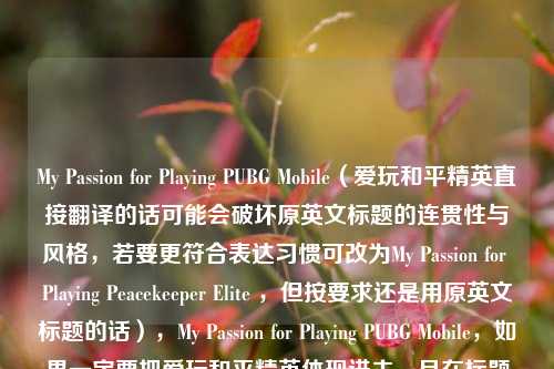 本文主要围绕“My Passion for Playing PUBG Mobile”展开,直译为“我对玩《和平精英》的热爱”,这一表述清晰地传达了个人对玩《和平精英》这款游戏有着浓厚兴趣与热情的核心内容,通过此英文表达,能让他人直观了解到作者对该游戏的喜爱之情,展现出玩《和平精英》在其生活中的重要地位,也反映出这款游戏在其兴趣爱好方面所占据的独特位置,吸引着读者进一步了解作者与游戏之间的故事及情感关联。