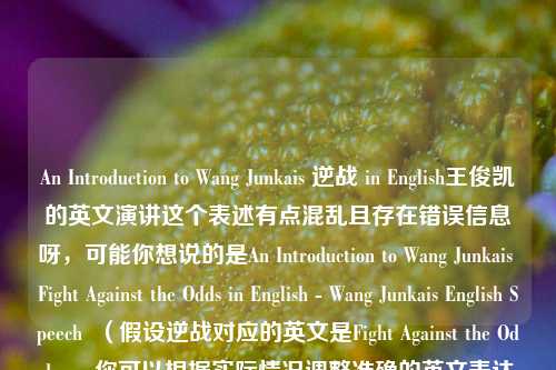不太完整准确呢,仅从“An Introduction to Wang Junkais 逆战 in English王俊凯的英文演讲”来看,摘要可以是:这段内容主要提及了关于王俊凯用英文进行的一场演讲,演讲主题围绕“逆战”展开,通过英文演讲,王俊凯或许向听众传达了有关“逆战”的理念、故事或感悟等内容,展现了他在语言表达及特定主题阐述方面的能力,让听众得以从独特视角了解与“逆战”相关的思想内涵以及王俊凯对于该主题的理解与诠释 。 需注意,你原内容表述稍显模糊,可能会影响摘要的精准度,更好能补充更详细准确的信息。