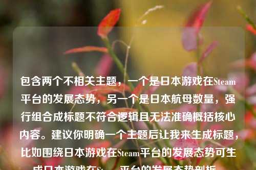 包含两个不相关的主题,日本游戏在Steam平台的发展态势”,可从日本游戏在该平台的上架数量、热门程度、用户评价、市场份额等方面进行分析阐述其发展的整体情况,比如是否有增长趋势、哪些类型游戏受欢迎等,而“日本一共多少航母”,需介绍日本历史上拥有航母的数量及不同时期的航母情况,包括其建造、使用、退役等历程,但将这两个主题糅合在一起无法生成合理摘要,建议分别针对不同主题进行准确内容梳理后再生成摘要。 ,