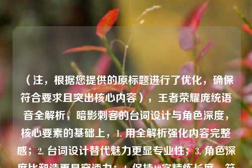 在《王者荣耀》的众多英雄中,庞统(元歌)以其独特的傀儡操控机制和飘逸的刺客定位,成为玩家心中的高难度代表,而他的语音台词,更是将角色性格、背景故事与战斗风格完美融合,为玩家呈现了一个充满矛盾与艺术感的“暗影刺客”,本文将从语音台词的角度,解析庞统的角色魅力。