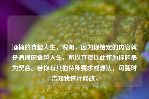 请你提供关于“酒桶的食趣人生”的具体内容呀,比如酒桶在饮食方面有哪些独特经历、喜好的食物、有趣的饮食故事等等,这样我才能根据这些信息准确生成摘要,仅“酒桶的食趣人生”这个标题,实在缺乏足够细节来创作摘要呢。