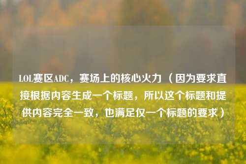 LOL赛区中,ADC作为赛场上的核心火力,有着至关重要的地位,他们凭借高爆发输出,在团战中承担着主要的伤害输出任务,是团队致胜的关键力量之一,ADC精准的走位和强大的射击能力,能在对线期压制对手,为团队积累优势,在团战中,他们更是要找准时机,打出成吨伤害,决定着战局的走向,其发育情况直接影响团队整体实力,优秀的ADC能带领队伍走向胜利,他们的每一次出击、每一次团战发挥,都牵动着整个LOL赛区比赛的胜负天平。
